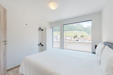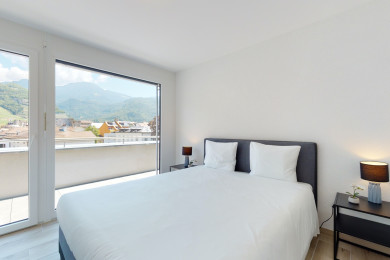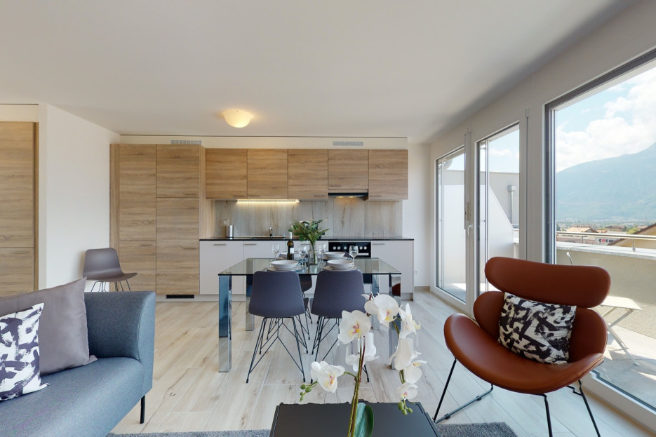 Moderne, helle Wohnung in der Residenz Nonanteneuf, nur wenige Schritte vom Bahnhof Aigle entfernt - idealer Ausgangspunkt für Ihre Ausflüge in die Region des Genfersees und Chablais.