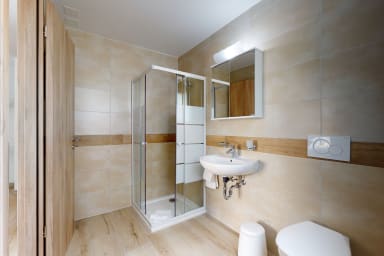 - Ein Badezimmer mit einer Dusche, einem Waschbecken und einer Toilette.
