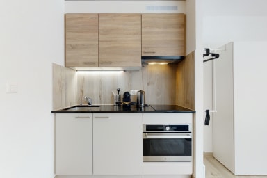 - Eine offene, voll ausgestattete Küche. Sie umfasst Kochplatten, einen Kühlschrank mit Gefrierfach, eine Mikrowelle sowie eine Nespresso-Kaffeemaschine. Außerdem finden Sie hier einen Essbereich.