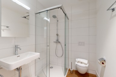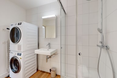 - Ein modernes Badezimmer mit einer Dusche, einer Waschmaschine und einem Trockner für Ihren Komfort.