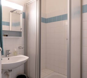 - Ein Badezimmer, das mit einer Dusche, einem Waschbecken und einem WC ausgestattet ist.