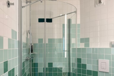 - Ein Badezimmer mit einer Dusche, einem Waschbecken und einer Toilette.