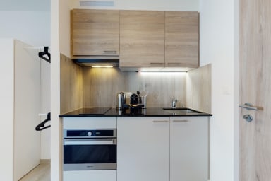 - A fully equipped open kitchen. It includes hotplates, a fridge with freezer compartment, a microwave oven and a Nespresso coffee machine. There is also a dining area.