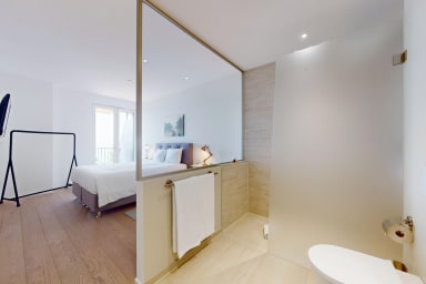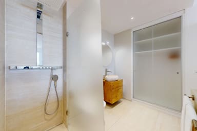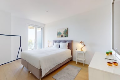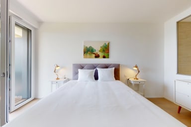 - A bright bedroom with a queen-size bed and storage space. The bedroom has direct access to the balcony, allowing you to admire the view and Lake Geneva as soon as you wake up. It is also equipped with a TV. The bedroom has its own bathroom with walk-in shower, WC, washbasin and a large wardrobe/closet for storing your clothes.