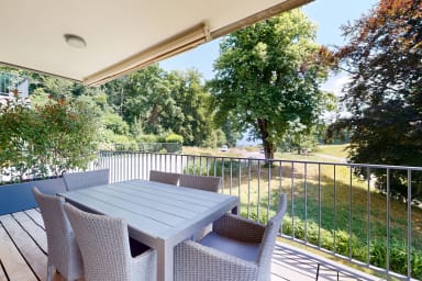 - A furnished balcony with panoramic views of Lake Geneva and the surrounding mountains. It comprises two areas, one with a table and chairs for dining, and the other with armchairs and sun loungers, ideal for relaxing. A perfect place to have your morning coffee, read a book or simply enjoy the scenery.
