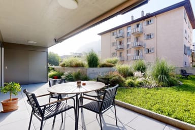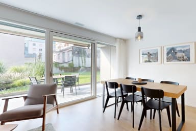 Modern apartment located a stone's throw from shops and the train station. Comfortably furnished, it features a large terrace on the ground floor.