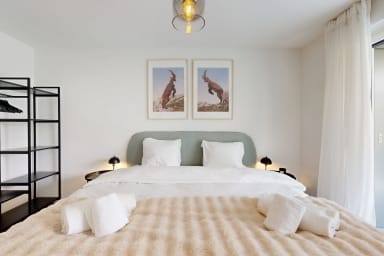 - A spacious bedroom with a king-size bed, storage space and direct access to a large terrace.