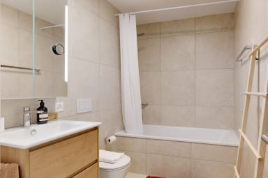 - A bathroom equipped with a bathtub, toilet and sink. You will also find a washing machine, ideal if you are planning a longer stay.