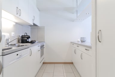 Une cuisine semi-ouverte, lumineuse et fonctionnelle, donnant sur la salle-à-manger et le salon. Elle comprend notamment une machine à café, un lave-vaisselle, ainsi qu'un four et un micro-ondes.