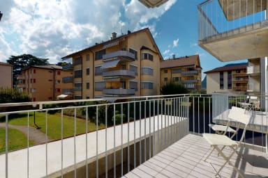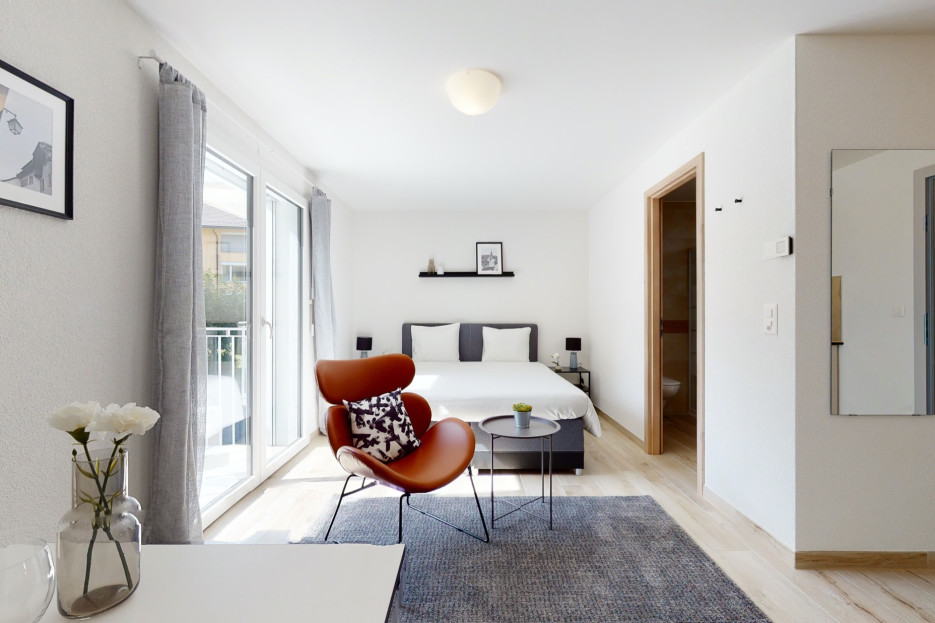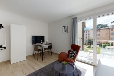 Studio moderne et lumineux dans la résidence Nonanteneuf à deux pas de la gare d’Aigle – point de départ idéal pour vos excursions dans la région du lac Léman et du Chablais.