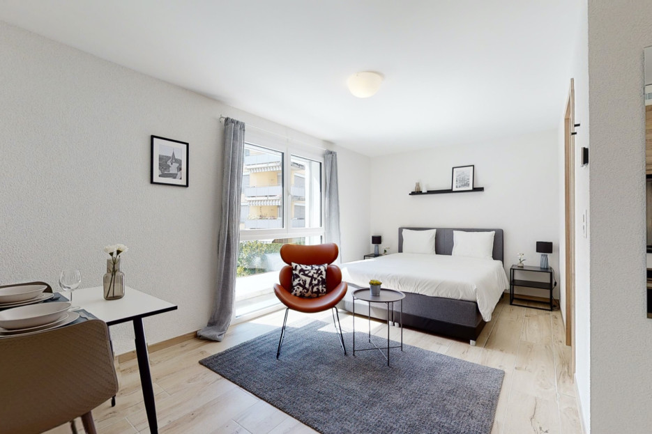 Studio moderne et lumineux dans la résidence Nonanteneuf à deux pas de la gare d’Aigle – point de départ idéal pour vos excursions dans la région du lac Léman et du Chablais.