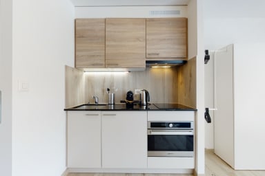 - Une cuisine ouverte entièrement équipée. Elle comprend des plaques de cuisson, un réfrigérateur avec compartiment congélateur, un four à micro-ondes, ainsi qu’une machine à café Nespresso. Vous y trouverez également un espace repas.