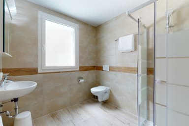 - Une salle de bain avec une douche, un lavabo et un WC.