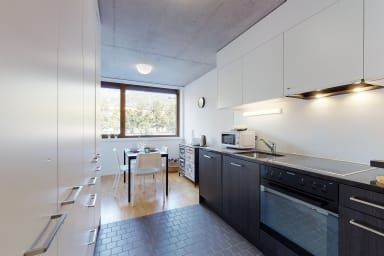 - Une cuisine ouverte et conviviale. Elle comprend notamment une machine à café, un four ainsi qu’un lave-vaisselle ;