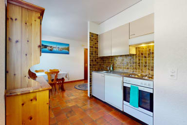 - Une pièce de vie comprenant une petite cuisine ouverte et agencée avec tout le nécessaire pour préparer vos repas. Un réfrigérateur, un congélateur, des plaques de cuisson, un four, un micro-ondes, ainsi qu’une machine à café Delizio sont à disposition. La table à manger adjacente offre un espace convivial pour vos repas. Un coin bureau est également aménagé, idéal pour le télétravail ou les études.